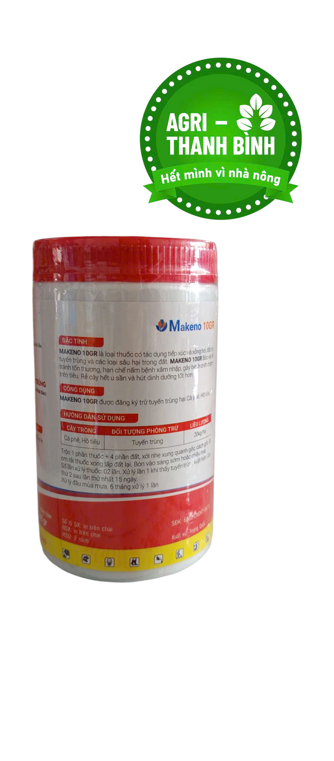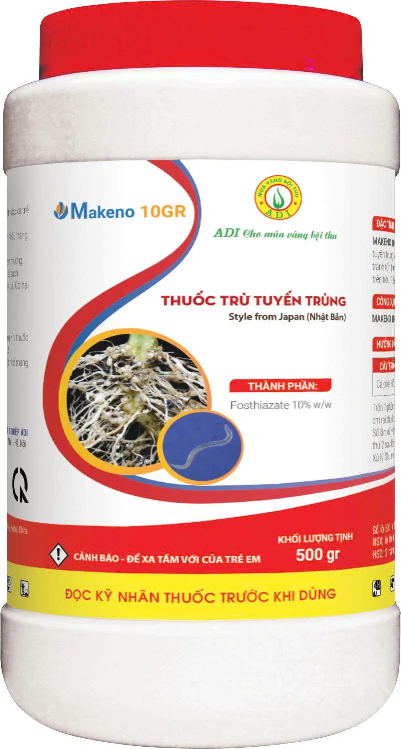 THUỐC TRỪ TUYẾN TRÙNG MAKENO 10GR – DIỆT NHANH TUYẾN TRÙNG, BẢO VỆ RỄ KHỎE MẠNH MAKENO 10GR là sản phẩm chuyên trị tuyến trùng với công nghệ từ Nhật Bản, hoạt chất Fosthiazate 10% w/w cho hiệu lực mạnh, thấm nhanh, tiêu diệt tuyến trùng ngay tại vùng rễ, giúp cây hồi phục – tăng hấp thu – phát triển ổn định.